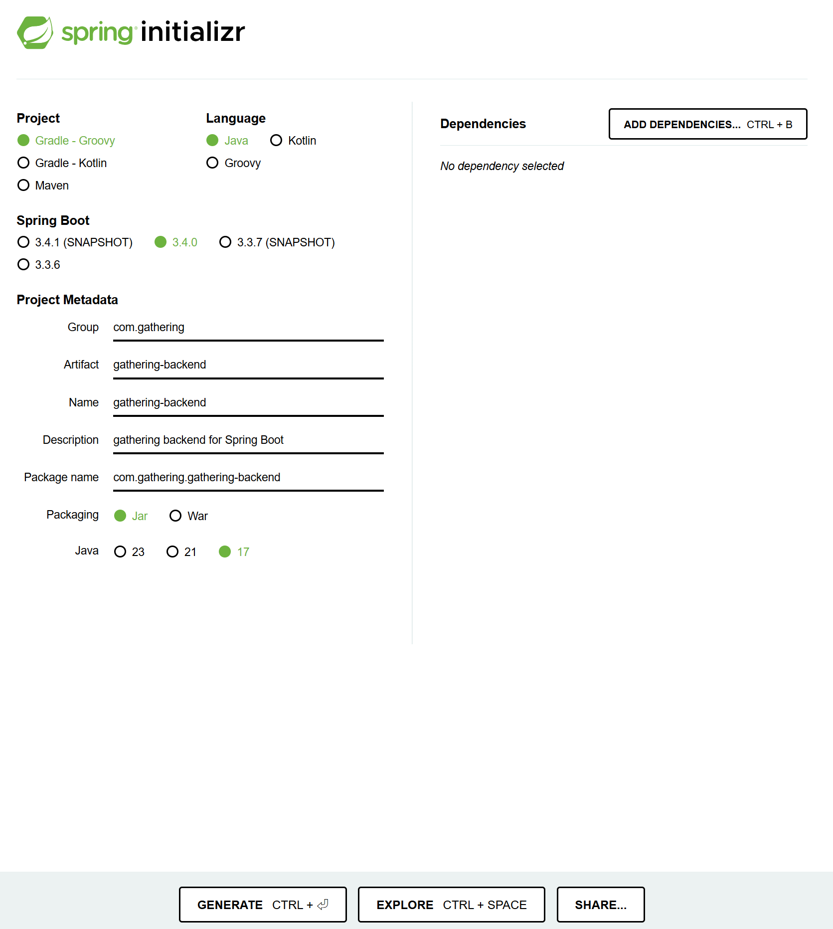 이에 따라 https://start.spring.io/ 를 이용하여 패키지를 생성한다.