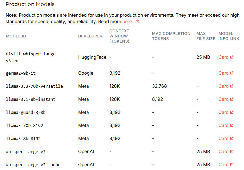 물론 제한량 (https://console.groq.com/docs/rate-limits)이 있긴하지만, 충분히 테스트 환경에서나 공부할때 사용할 수 있을 것으로 보인다.