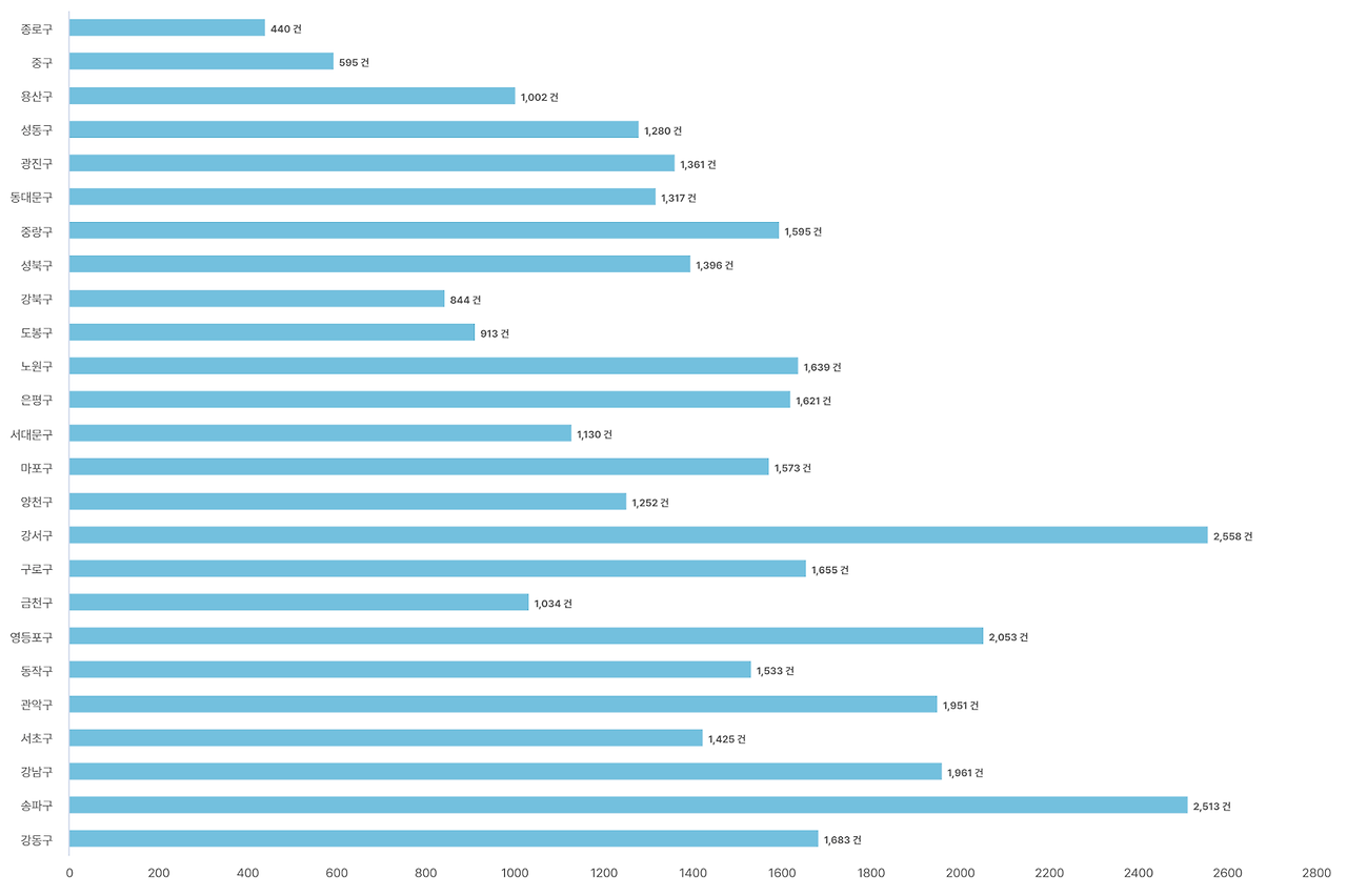 * **감소률이 1% 이상인 구:** 종로구(-1.15%), 용산구(-2.65%), 강북구(-1.59%), 도봉구(-1.43%), 양천구(-1.07%), 강서구(-1.01%), 노원구(-1.00%)
