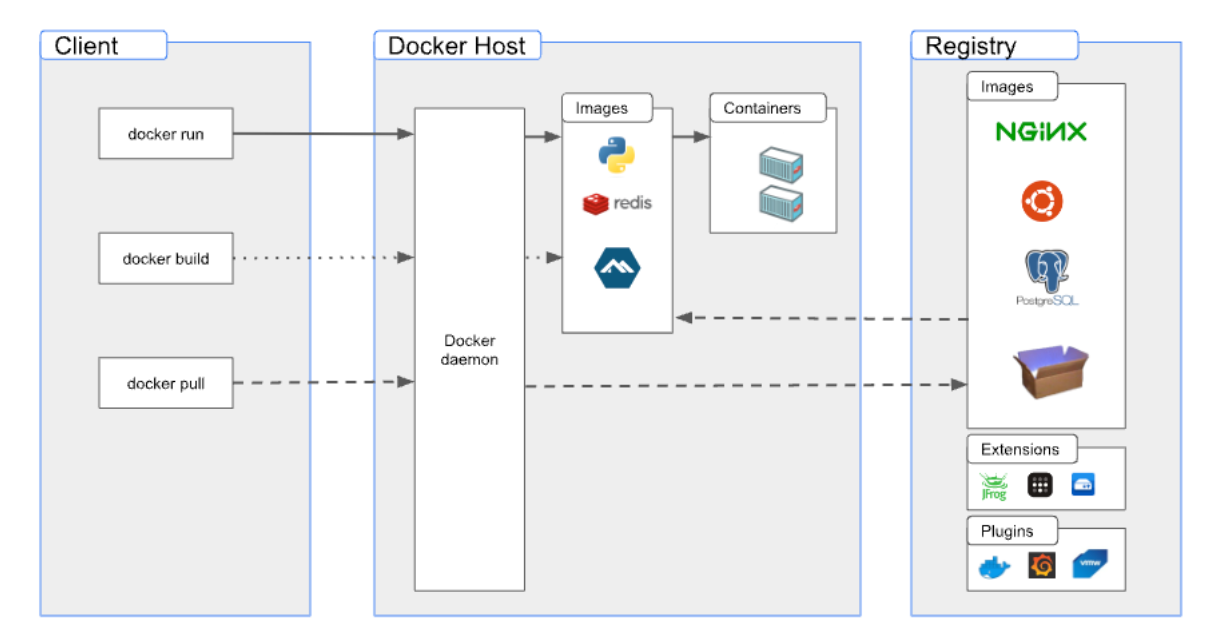 - 도커 클라이언트 (Docker Client): 사용자가 도커 명령어를 통해 도커 데몬에 명령을 전달하는 인터페이스이다. 클라이언트는 주로 docker 명령어를 사용하여 도커 데몬과 상호작용하며, 도커 이미지를 빌드하거나 컨테이너를 실행하는 등의 작업을 처리한다.